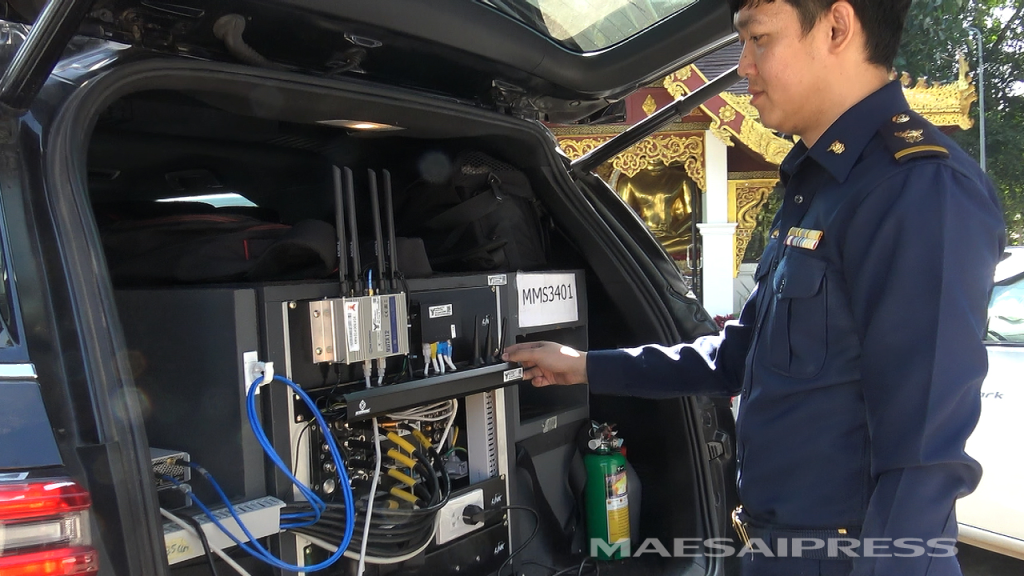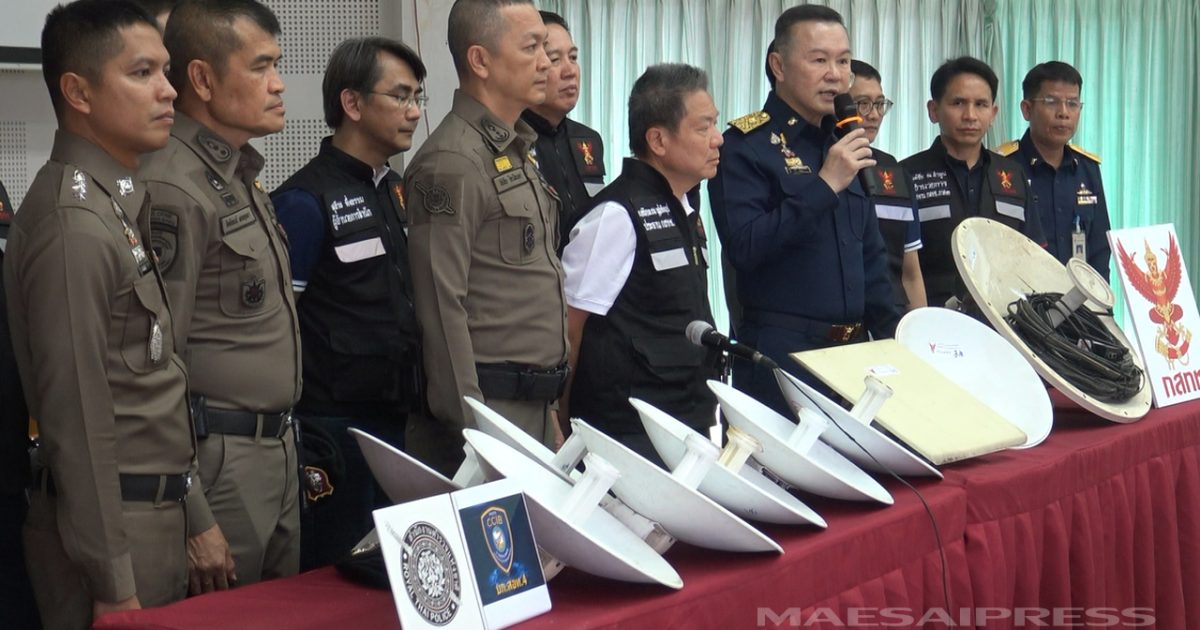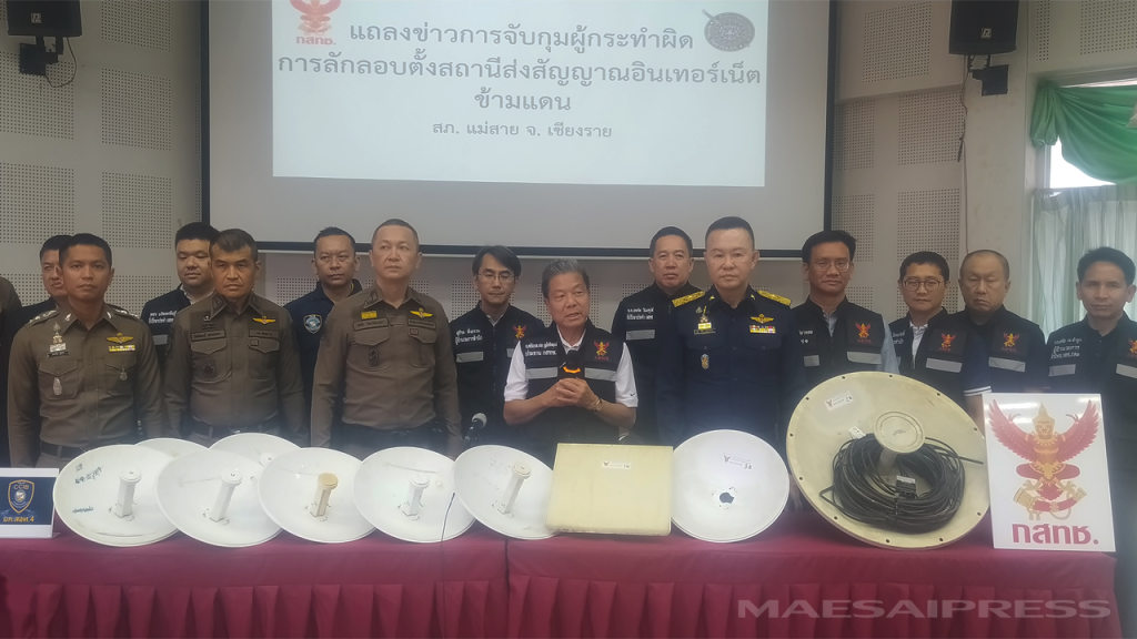 วันที่ 9 ม.ค. 2567 กสทช.ได้นำรถโมบายเคลื่อนที่ พร้อมอุปกรณ์ตรวจจับสัญญาน อินเทอร์เน็ตตวามเร็วสูง ก่อนจะตรวจพบอาคารหลังหนึ่ง ในพื้นที่ชายแดน ต.เวียงพางคำ อ.แม่สาย จ.เชียงราย ทำการส่งสัญญานอินเทอร์เน็ตแรงสูง ข้ามไปประเทศเพื่อนบ้านไกลกว่า 30-40 กม. จึงเข้าทำการรื้อถอน ต่อมาเวลาประมาณ 15.00 น. วันที่ 9 ม.ค. 2567 ที่สถานีตำรวจภูธรแม่สาย พล.ต.อ.ณัฐธร เพราะสุนทร กสทช.ด้านกฏหมาย / พล.ต.ท.ดร.ธัชชัย ปิตะนีละบุตร ผู้ช่วย ผบ.ตร. ดูแลงานด้านป้องกันและปราบปรามอาชกรรมเทคโนโลยี / เจ้าหน้าที่ กสทช. และ สภ.แม่สาย ได้ร่วมแถลงข่าว การจับกุมสถานีโทรคมนาคมผิดกฎหมาย ส่งสัญญานอินเทอร์เน็ตแรงสูง โดยหันจานส่งไปยังประเทศเพื่อนบ้าน ประกอบด้วยเครื่องวิทยุคมนาคม , อุปกรณ์จ่ายสัญญาน , สายนำสัญญาน และหัวต่อ จำนวนมาก โดยกล่าวว่า “ ปัจจุบันยังพบว่า มีการตั้งสถานีโทรคมนาคม และเสาสัญญานผิดกฏหมายอีกหลายแห่ง ทาง สตช.และ กสทช.กำลังเร่งดำเนินการสืบสวน และรวบรวมพยานหลักฐาน เพื่อขอหมายศาล……เรื่องนี้ ได้กำชับไปยังตำรวจภูธรภาค ที่มีพื้นที่รับผิดชอบติดกับแนวชายแดนประเทศเพื่อนบ้าน ให้ร่วมกับหน่วยงานที่เกี่ยวข้อง ลงพื้นที่สืบสวนหาข่าว การลักลอบตั้งสถานีโทรคมนาคมผิดกฎหมายในลักษณะดังกล่าว เพื่อสกัดไม่ให้แก็งคอลเซนเตอร์ เข้าถึงสัญญานได้โดยง่ายเหมือนอดีตที่ผ่านมา ” และเตรียมแก้ไข ยกร่างประกาศ กสทช. เพื่อกำหนดหลักเกณฑ์ และวีธีการที่ชัดเจน ก่อนให้อนุญาต ผู้ที่ประสงค์จะตั้งเสาสัญญานใหม่ ในพื้นที่ชายแดน รวมถึงให้มีระยะร่นจากเส้นเขตแดน และต้องหันทิศทางการแพร่สัญญานเข้ามาในประเทศไทย….โดยของกลางทั้งหมด นำส่ง พนักงานสอบสวน สภ.แม่สาย ดำเนินคดี