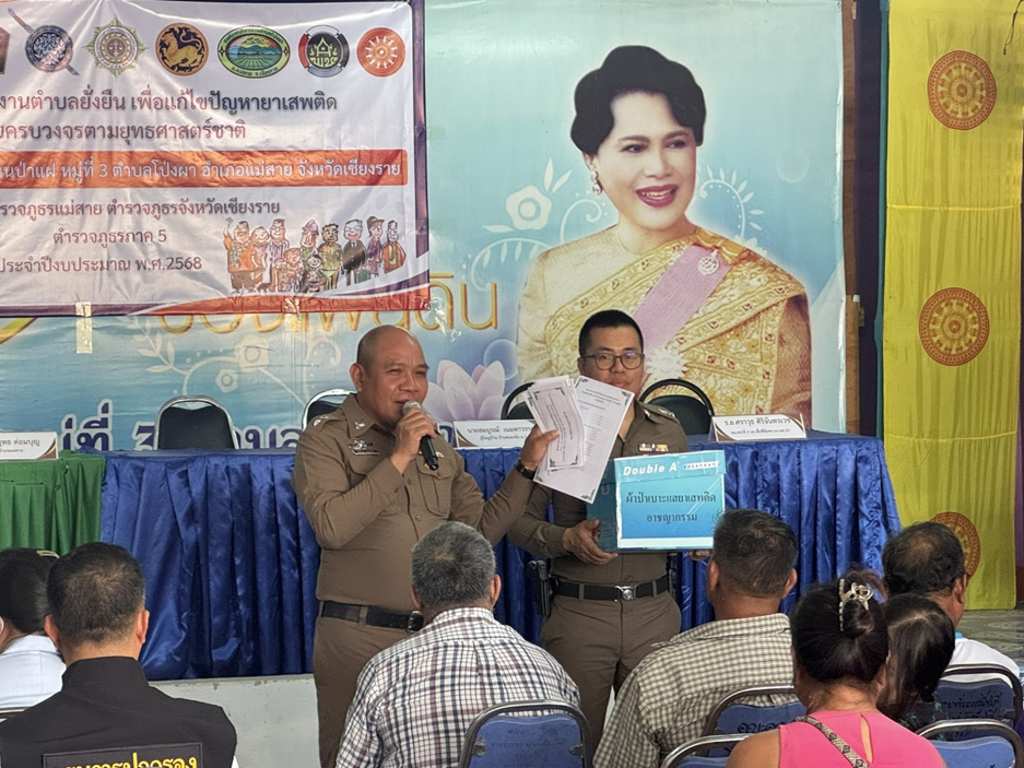 สภ.แม่สาย จว.เชียงราย วันที่ 11 มี.ค. 68 เวลา 10.00 น. สภ.แม่สาย ได้จัดพิธีเปิดโครงการตำบลยั่งยืน เพื่อแก้ไขปัญหายาเสพติด แบบครบวงจรตามยุทธศาสตร์ชาติ บ้านหนองอ้อ ม.2 และบ้านป่าแฝ ม.3 ต.โป่งผา อ.แม่สาย จ.เชียงราย นายวรายุทธ ค่อมบุญ นายอำเภอแม่สาย เป็นประธานในพิธี พ.ต.อ.เทคนิค จันสี ผกก.สภ.แม่สาย, พ.ต.ต.สันทัด ต่างเพ็ชร สวป.(ชส.)สภ.แม่สาย, ฯลฯ พร้อมชุดปฏิบัติการตำบลยั่งยืนฯ ได้ร่วมลงนามบันทึกข้อตกลงให้ความร่วมมือ MOU หน่วยงาน ได้ทำประชาคมโครงการฯ ในหมู่บ้าน จัดทำกล่องแสดงความคิดเห็นผ้าป่าเบาะแส ณ อาคารอเนกประสงค์บ้านป่าแฝ ม.3 ต.โป่งผา อ.แม่สาย จ.เชียงราย